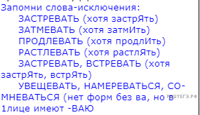 | Буквы Е или И перед ударным суффиксом ВА | От глаголов с суффиксами -ИВА-/-ЫВА-, -ЕВА-/-ОВА- следует отличать глаголы, образованные при помощи суффикса -ВА-. Перед ударным суффиксом -ВА в глаголах несовершенного вида пишется та же гласная буква, что и в неопределенной форме, если в ней отбросить этот суффикс -ВА-. | ПовелеВАть — отбрасываем ударный суффикс -ВА, получаем повелЕть, такой глагол есть, значит, правило применено верно; ПретерпеВАть — отбрасываем ударный суффикс-ВА, получаем претерпЕть, такой глагол есть. Если же отбросить суффикс ВА нельзя, значит, нужно использовать основное правило: например, в слове «ночевать» также ударение падает на ВА. Но отбросить его не удаётся, нет такого слова «ночеть»; в слове «горевать» также не ВА, а ЕВА, так как слово «гореть» уже другое по значению, с «горевать» не однокоренное. |