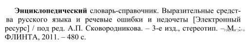 4) Эн­цик­ло­пе­ди­че­ский сло­варь-спра­воч­ник. Вы­ра­зи­тель­ные сред­ства рус­ско­го языка и ре­че­вые ошиб­ки и недочёты / под ред. А.П. Ско­во­род­ни­ко­ва. – 3-е изд., стер. – М.: Флин­та, 2011.