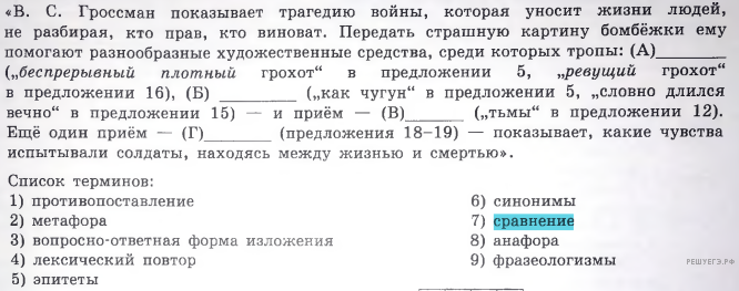 «(А)_____ (предложения 17—20) помогает автору передать основную мысль текста. Сравнивая человеческую жизнь с жизнью дерева, автор в 15-м предложении использует (Б)_____ («шагал по свету, мечтал, воевал, ссорился, кому-то завидовал, ревновал, искал славы, отчаивался, ленился, писал...»). Жизнь дерева отличается от жизни человека. Такой троп, как (В)_____ («срез, словно картину» в предложении 19), наводит автора на вопрос: «Как же прожить жизнь, чтобы не жалеть о сделанных ошибках, чтобы сохранить себя, выстоять в невзгодах и испытаниях?» Отвечая на этот вопрос, Д. Гранин использует (Г)_____.